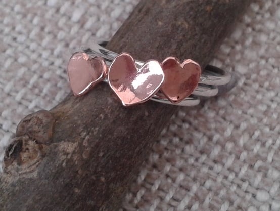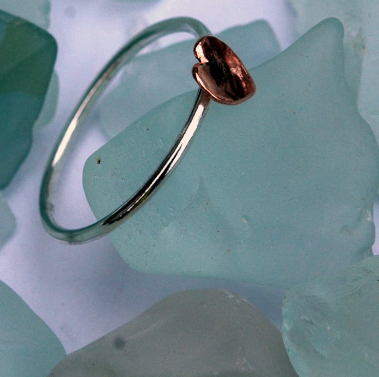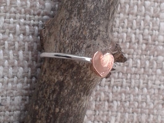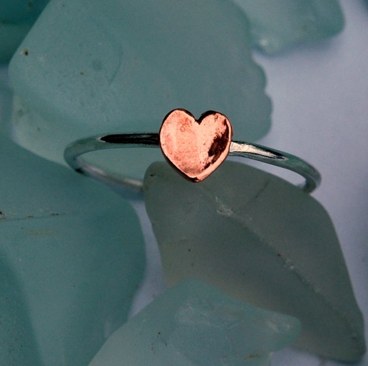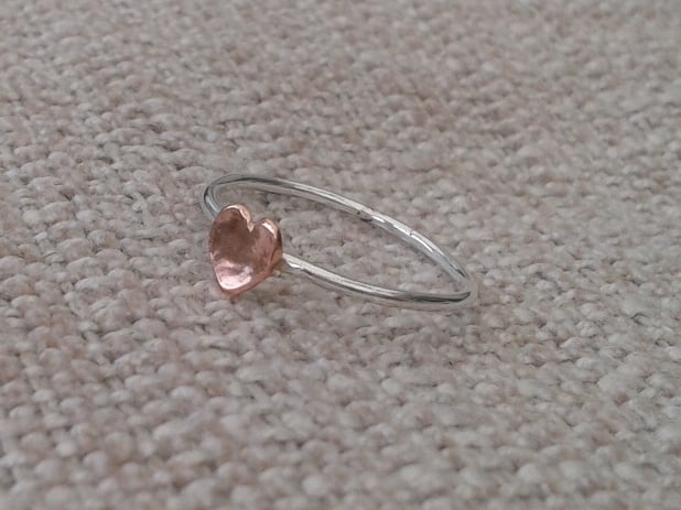 This slimline ring is lovely worn on its own or as part of a stack. It is made from 1mm sterling silver round wire, with a 5mm domed copper heart added for a touch of romance. The whole ring has been polished to a high shine and the copper treated with metal lacquer to keep it bright and prevent tarnishing. The ring is currently available in UK size M.