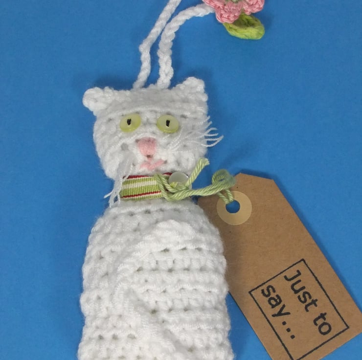 A greeting and keepsake in one, this crocheted cat comes bearing a ‘Just to say’ tag so that it can carry a message on your behalf. If you would like me to add a printed message to the back of the tag and post it directly to the recipient, please contact me via email.