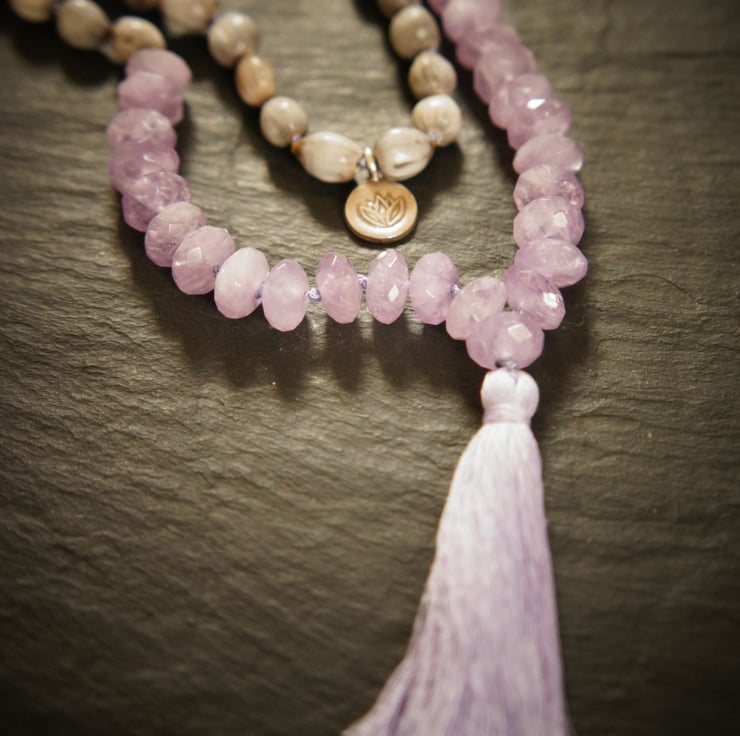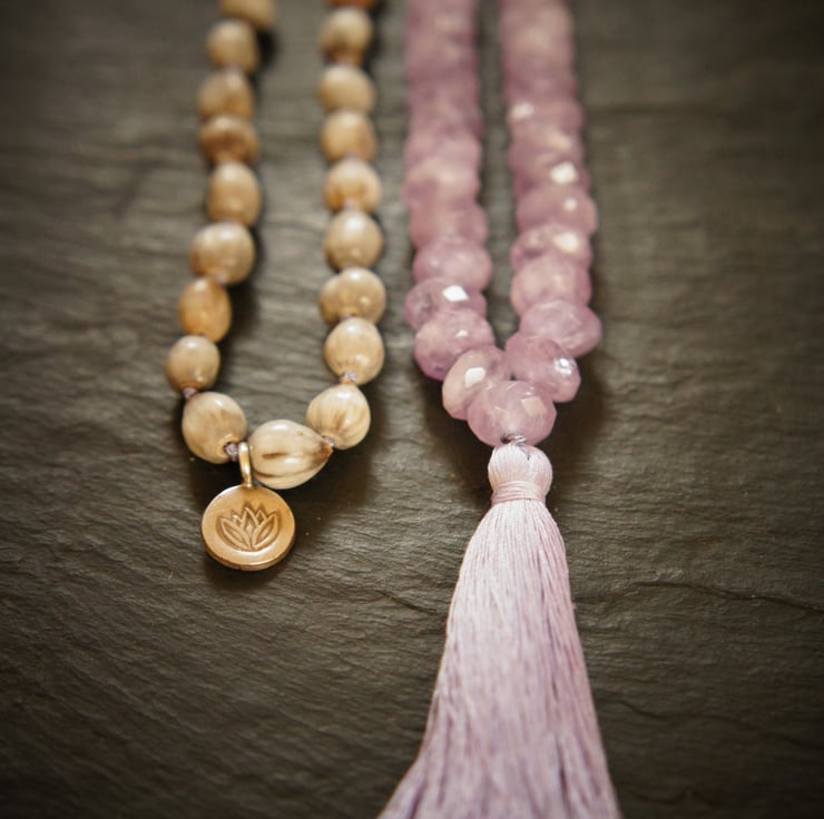 A 108 beaded Mala. Threaded onto pure silk with a 108 thread cotton flower/tassle.