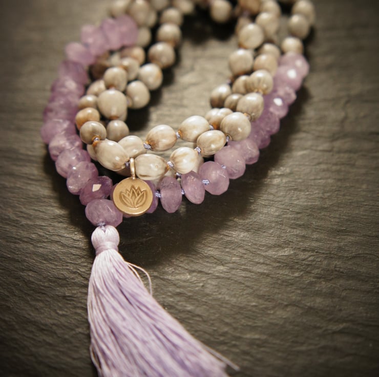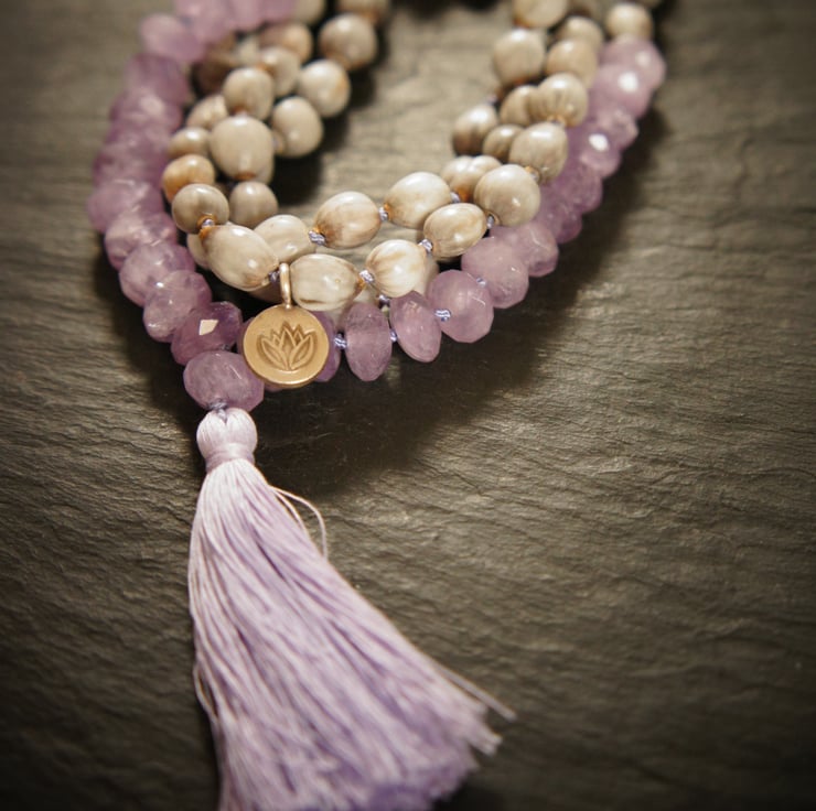 A Pale Lavender Amethyst and Vaijayanti Seed Third Eye Chakra Mala.