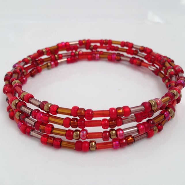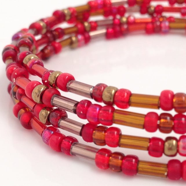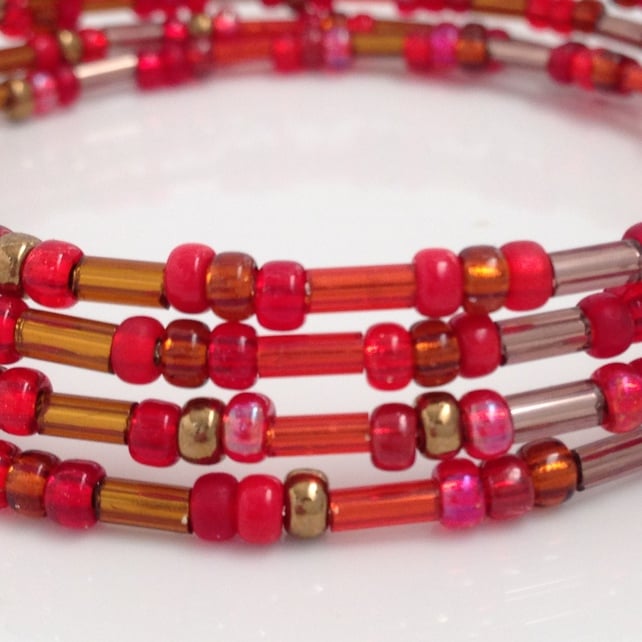 This memory wire bracelet has been made using size 8 Miyuki seed beads in magma mix (gold, red and bronze), with the addition of some bugle beads in orange, gold and light brown to create variety in the piece.