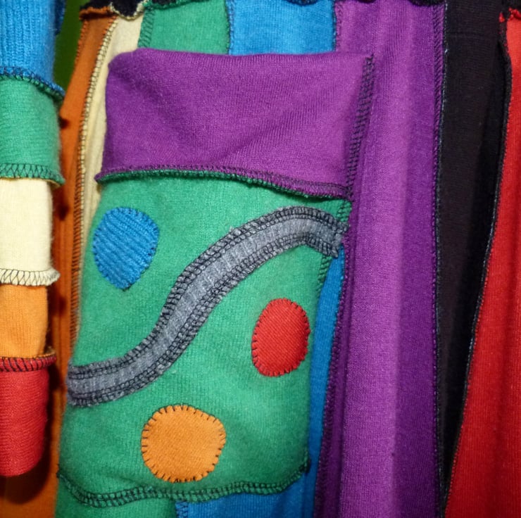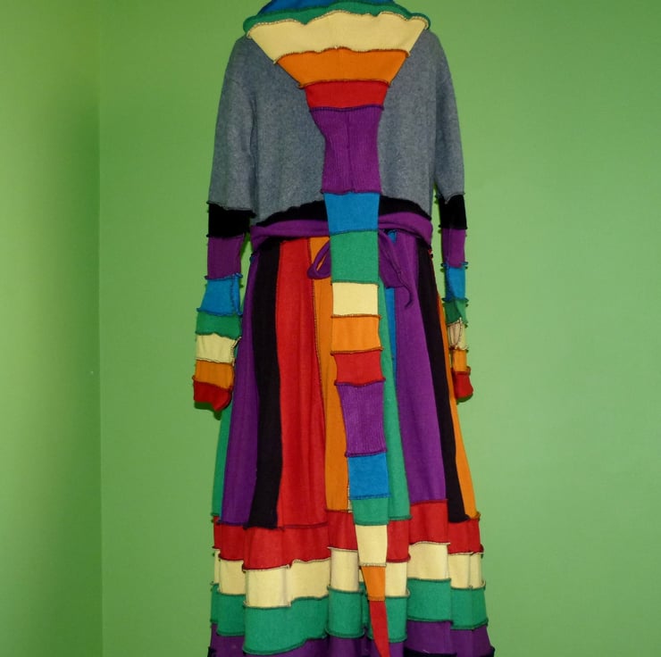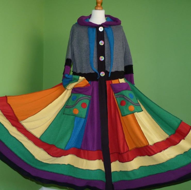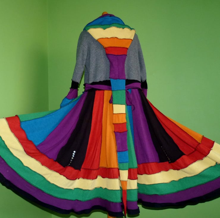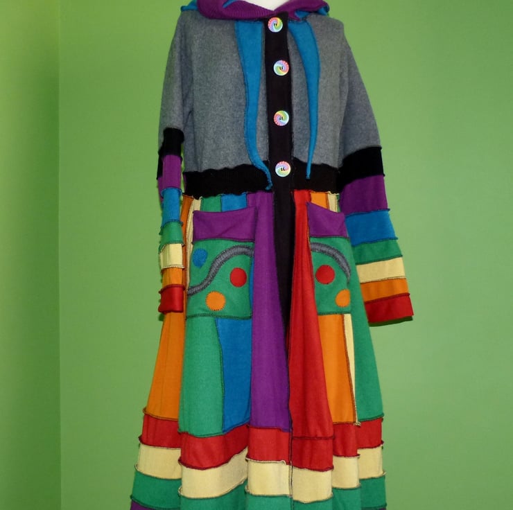 This fantastic up-cycled coat is created from wool, cashmere and acrylic jumpers to create the full rainbow of colours. These are previously loved and recycled jumpers, that I have washed in a hot temperature and pre-shrunk. I have then cut and re-stitched the jumpers, with all seams being professionally finished with a serger/over-locker, to create this fabulous coat. The bodice is created from a pure wool jumper