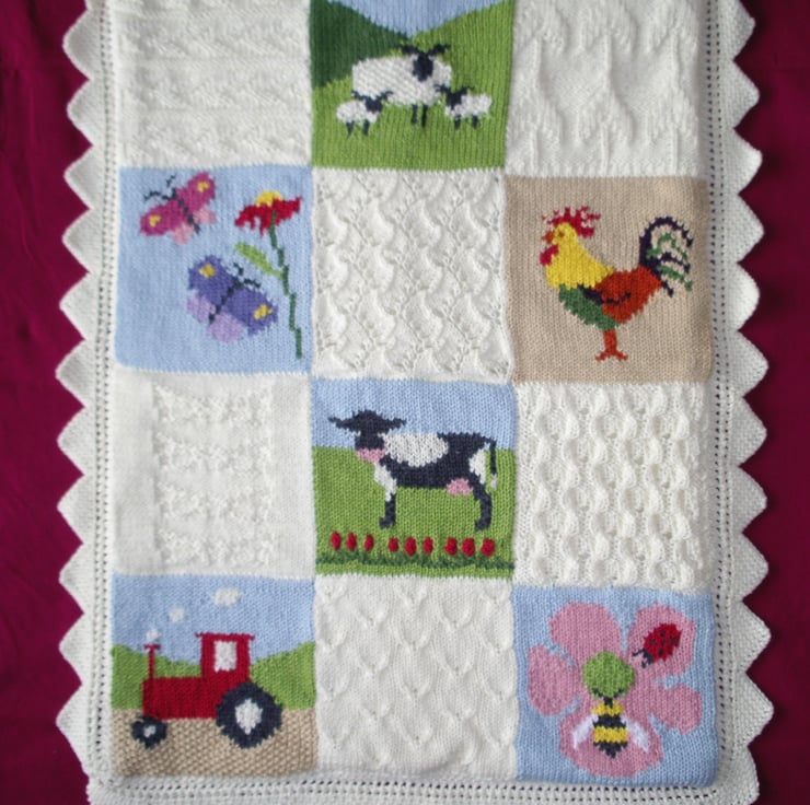 Knitting kit for a small Country Baby Blanket 45cm x 60cm. The pattern is NOT included, please order a PDF copy from my Knitting Patterns Collection or message me if you would prefer a printed copy on good quality paper. There is a choice of edging shade: Ecru (cream) or Green, please choose in "choose options" when ordering.