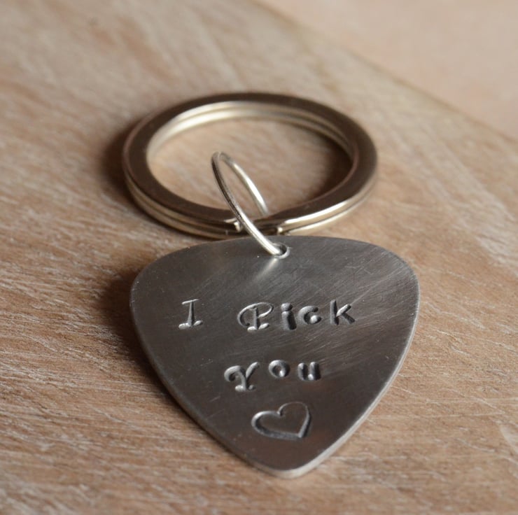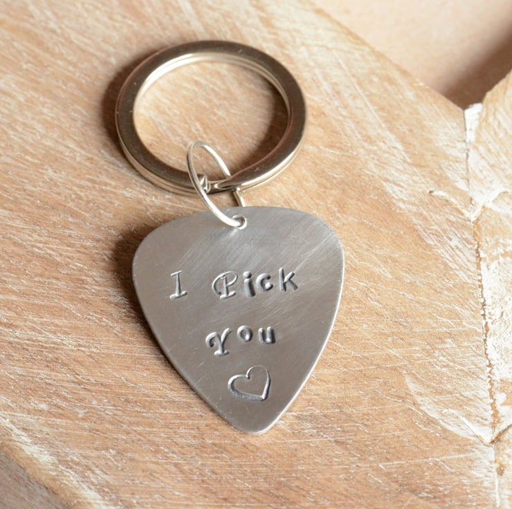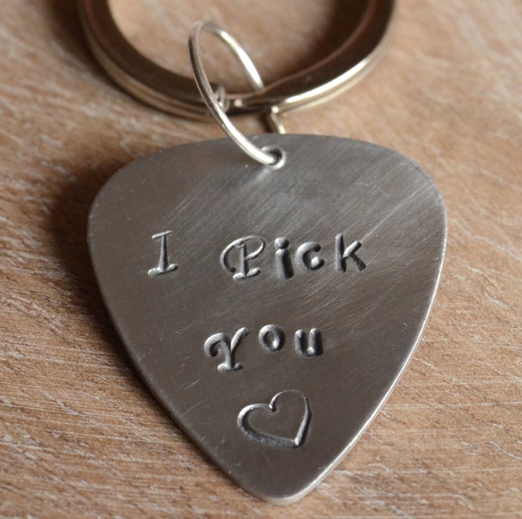 I have hand stamped an Aluminium guitar pick blank with the words "I Pick You" with a little heart below. The pick has been hand polished and a silver plated keyring added to finish.