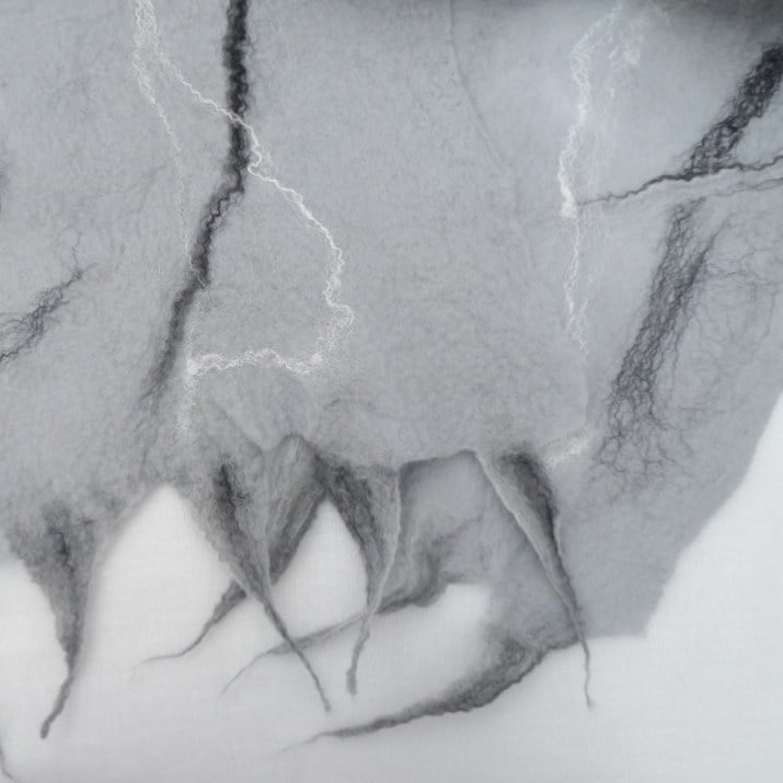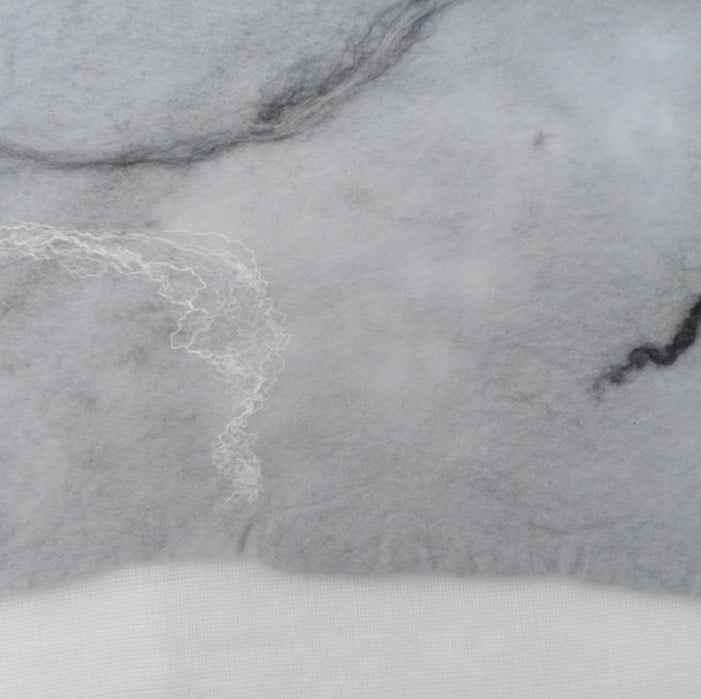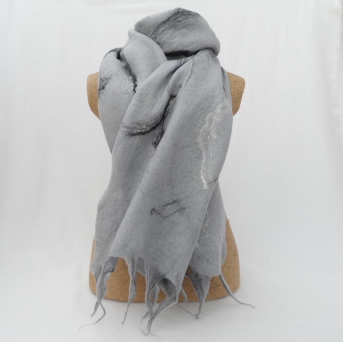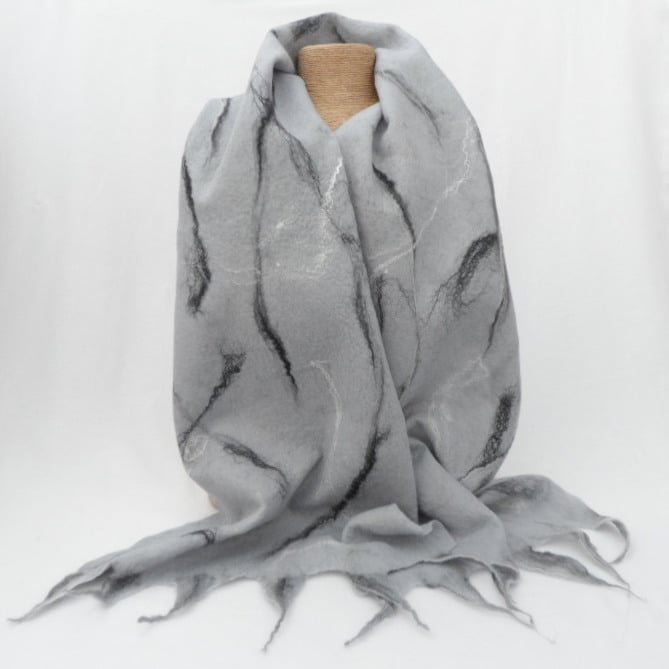 A fabulous scarf hand felted using seal grey merino wool with the addition of black, grey and white merino wool and silk fibres to the surface. Tassels have also been added to the scarf. This scarf is very light weight and quite sheer in places - I have tried to illustrate this in the 4th photograph - this in no way detracts from the warmth or beauty of the item.