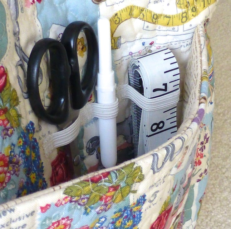 There's a large pocket on the front or inside for your patterns, and places to hold your essentials like scissors and tape measure.