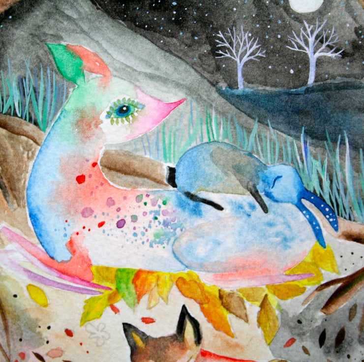 I love the natural world, I love children books about adventures animals have, and I create my own little narrative into my paintings.