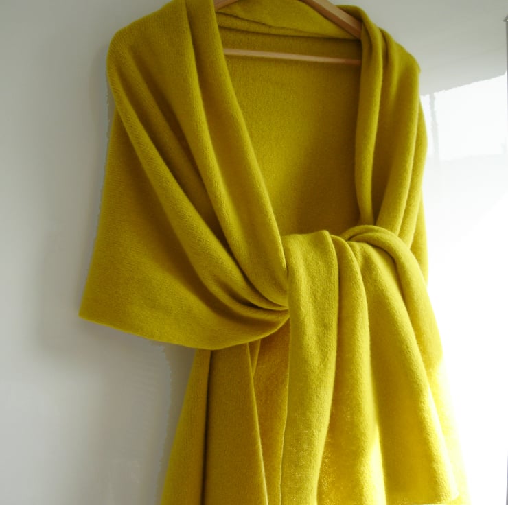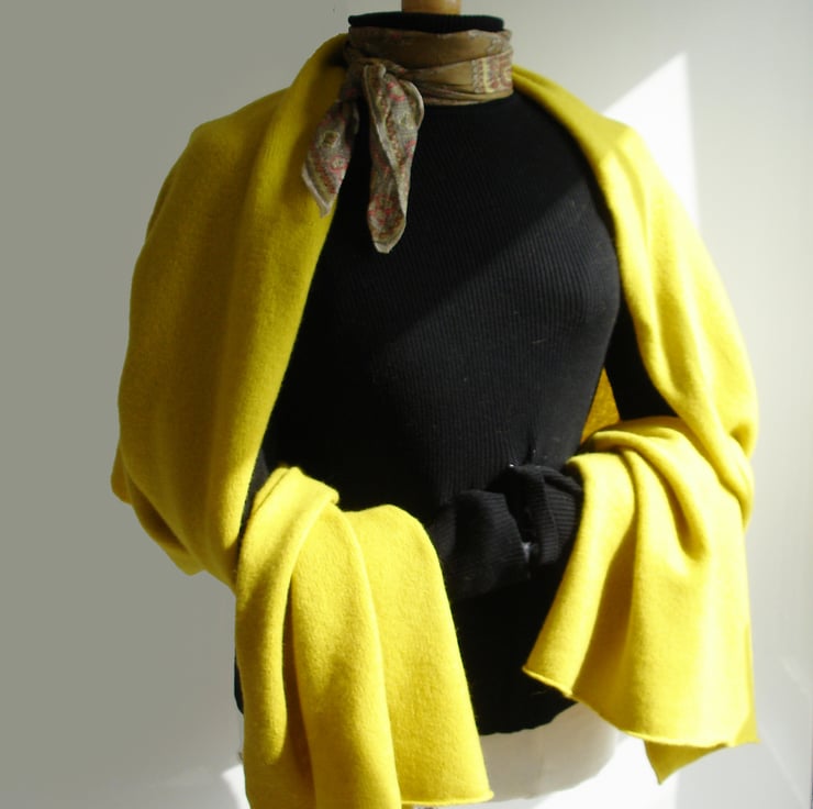 Lambswool wrap that looks great worn as a wrap, shawl or scrumptious, oversized scarf and the images show the versatility of this item. The deep yellow colour will brighten any day!
