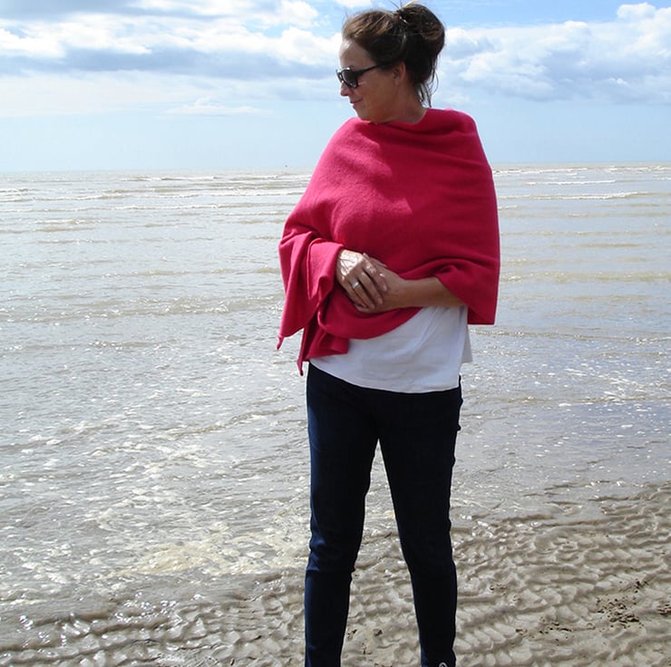 Lambswool wrap that looks great worn as a wrap, shawl or scrumptious, oversized scarf and the images show the versatility of this item.