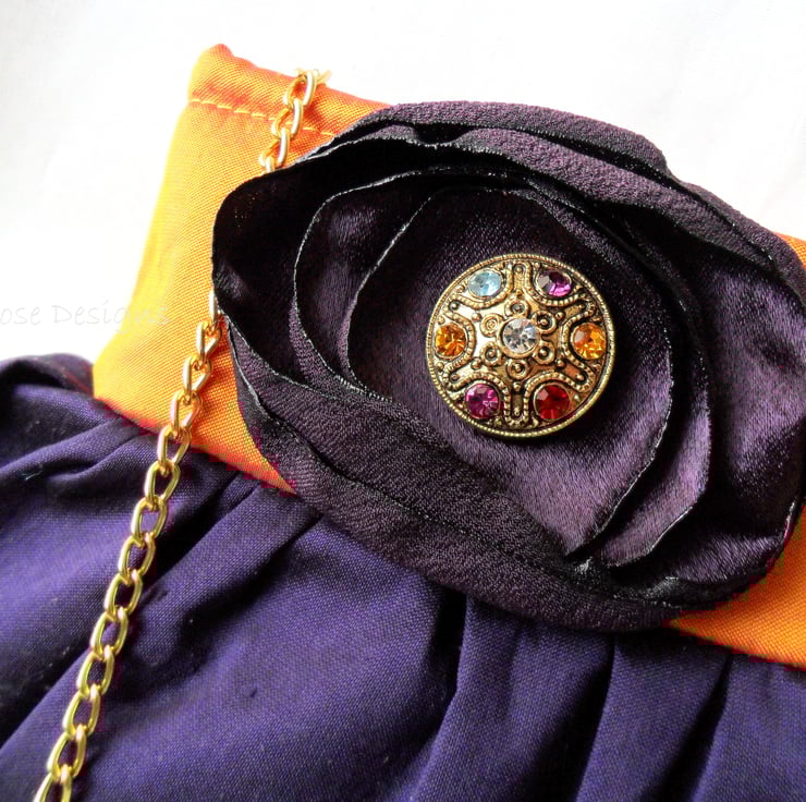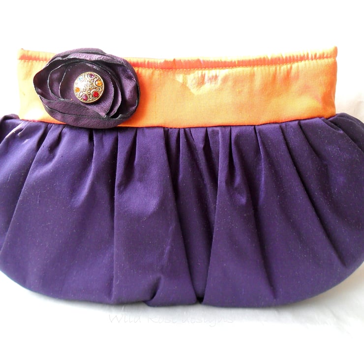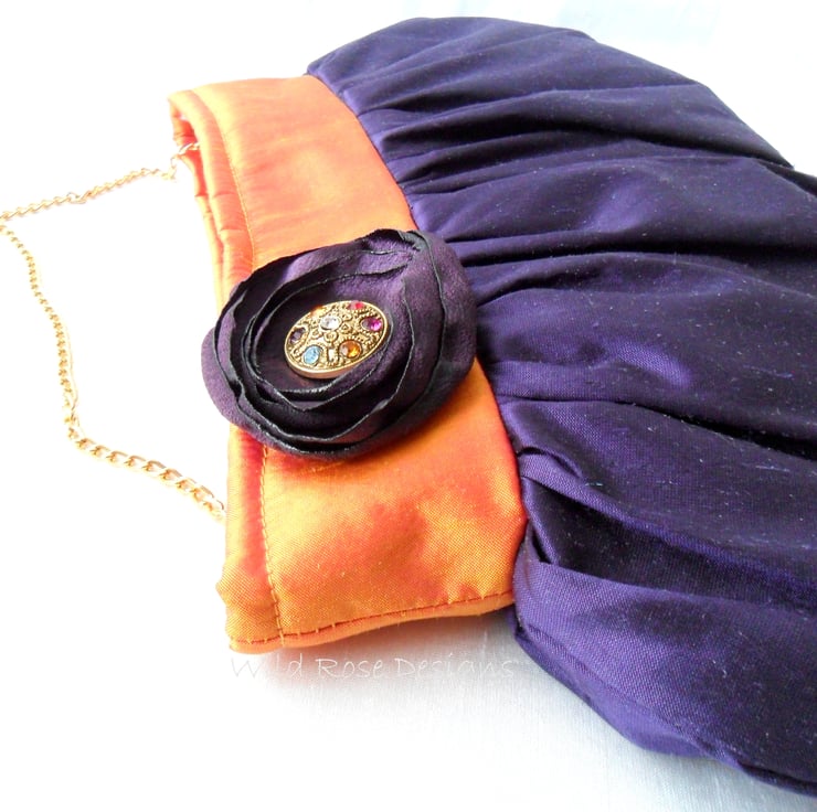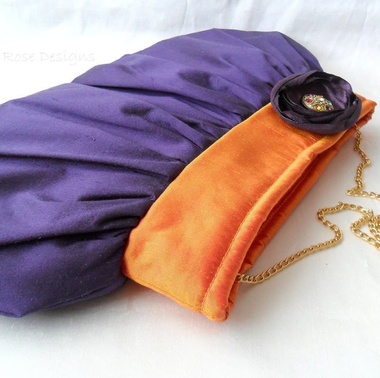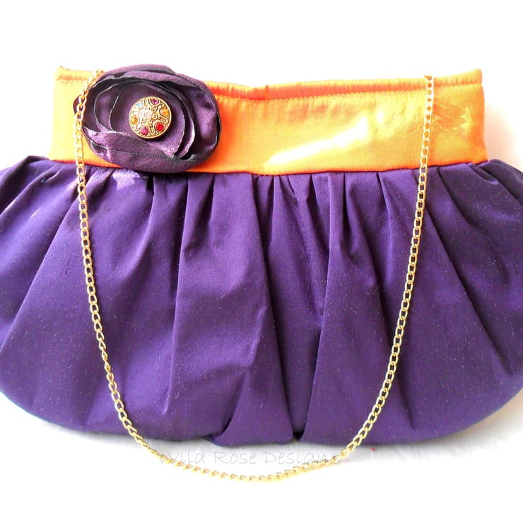 A stunning evening bag handmade in a gorgeous purple silk dupion which has been gathered onto an orange silk band. It is lined in a striking orange satin and has two inside pockets, one of which is zipped. This gorgeous bag is finished with a handmade decoration with a pretty button and it fastens with a magnetic snap. There is a 50 cm (19 3/4") gold coloured chain handle, which can be removed or tucked inside, so that the bag can be used as a clutch.