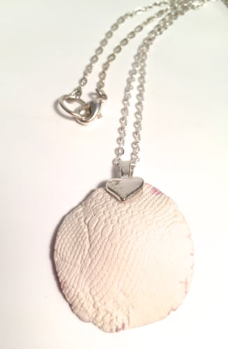 The porcelain disc measures 3x3.5cm and hangs from a silver heart bail and chain.