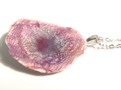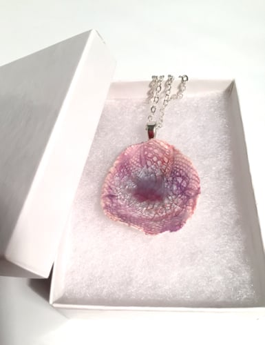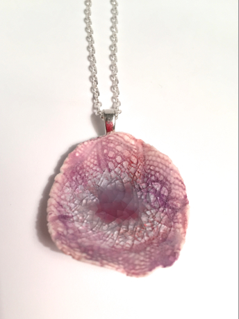 A textural porcelain necklace hand shaped with love and fired twice with an lilac glaze and glass.