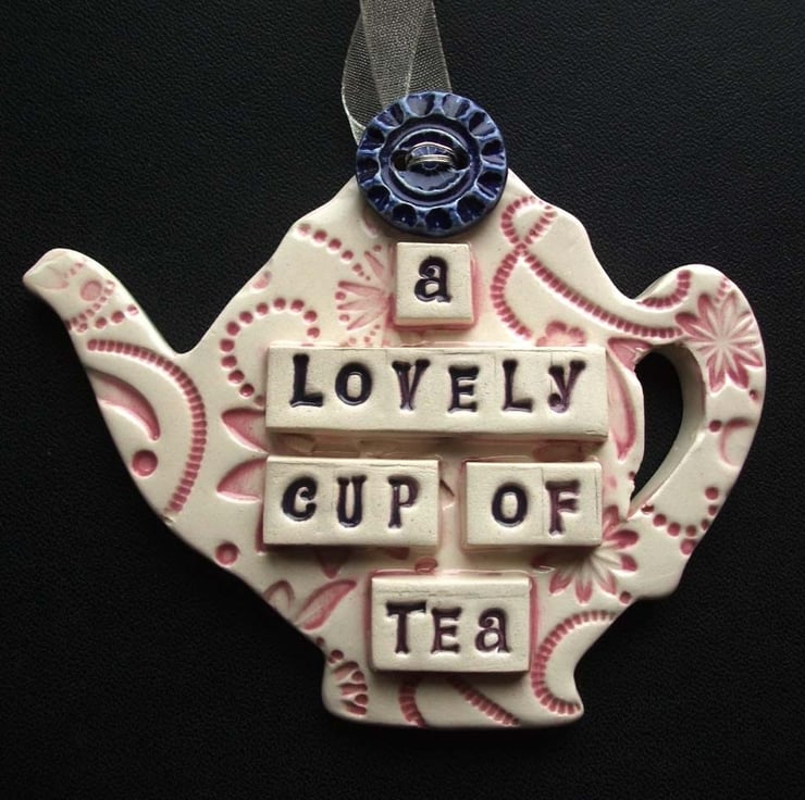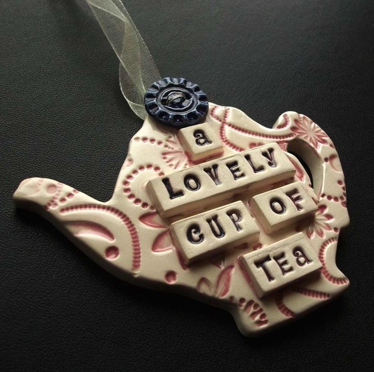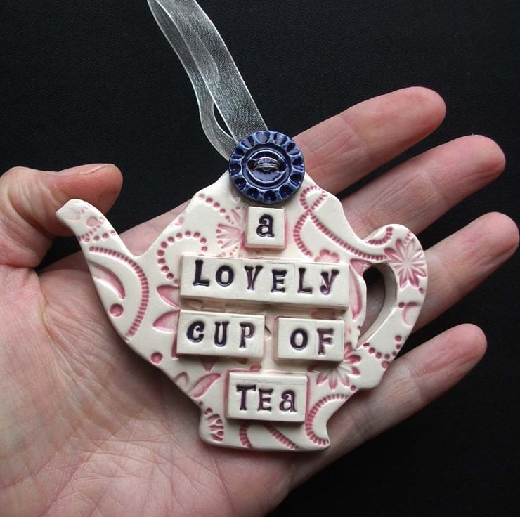 This little hanging teapot decoration is made from white earthenware clay and has the words A lovely cup of tea on it.