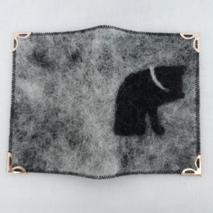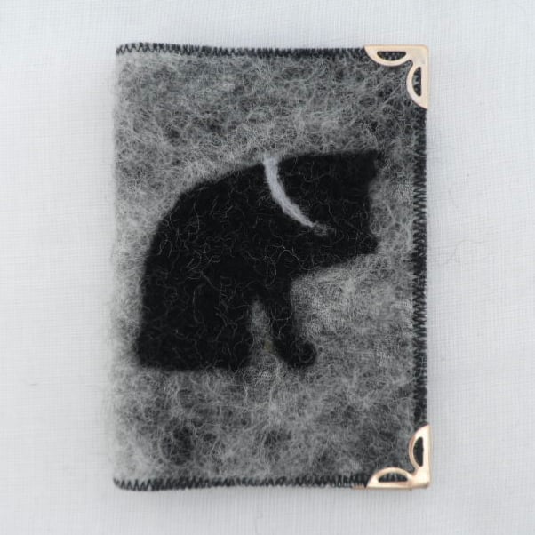 A simple card holder for your business cards/credit cards. Hardwearing black plastic on the inside with an outer covering of handmade felt stitched securely into place. The felt has been made using a nuno felting technique whereby black NZ perendale wool with a fine covering of white NZ perendale wool has been felted to a cotton muslin base to give it strength and stability. A black cat silhouette has also been felted onto the front cover. Complete with gold coloured metal corner protectors to increase durability. It measures approximately 3" x 4" and has two pockets available for cards. Each pocket can take several cards.