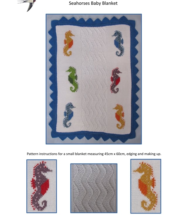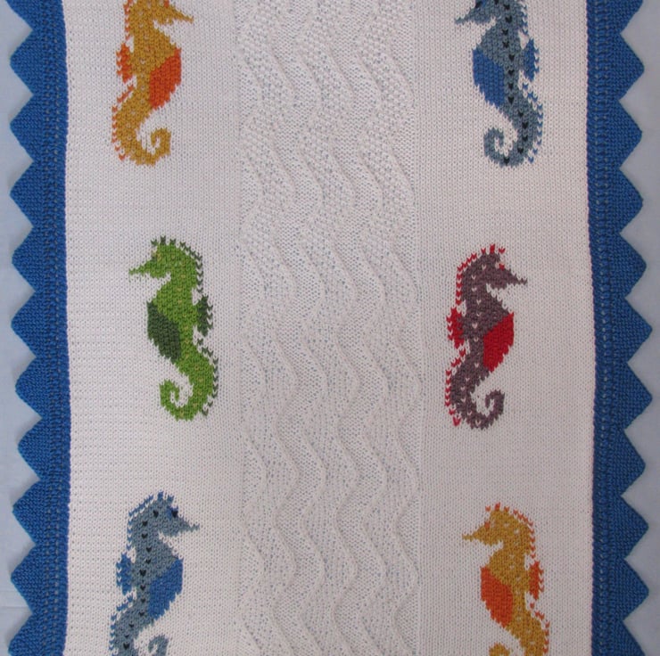 The blanket is knitted in one piece and the edging knitted separately and sewn on. There are written instructions for the central textured panel and a chart for the two seahorse panels. The chart is provided in two formats: 1 x A3 (11 x 17) and 2 x A4 (8.5 x 11). If you do not have an A3 printer or would prefer to print two A4 charts and join them together there are instructions for how to do this.