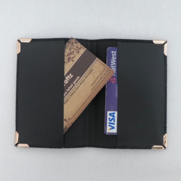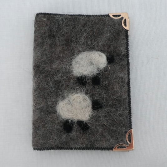 A simple card holder for your business cards/credit cards. Hardwearing black plastic on the inside with an outer covering of handmade felt stitched securely into place. The felt has been made using a nuno felting technique whereby black NZ perendale wool with a fine covering of white NZ perendale wool has been felted to a cotton muslin base to give it strength and stability. A couple of white woolly sheep have been felted onto the front cover. Complete with gold coloured metal corner protectors to increase durability. It measures approximately 3" x 4" and has two pockets available for cards. Each pocket can take several cards.