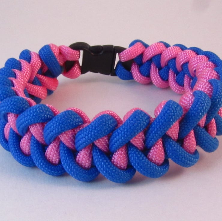 This is a pretty blue pink shark jaw bone paracord bracelet. It is created using one continuous piece of 550 (7 strand) Type III Commercial Paracord from the USA, and a plastic buckle with a side opening for ease of use. Unravel the bracelet for 6 - 8 ft of usable Paracord, think one foot for one inch of bracelet. These bracelets are really comfortable to wear, I have a version of this one that I wear a lot.