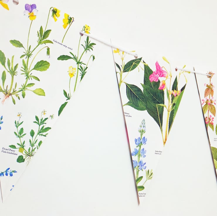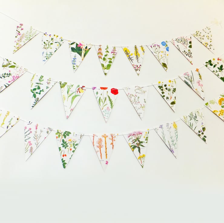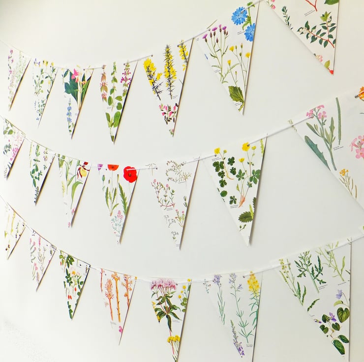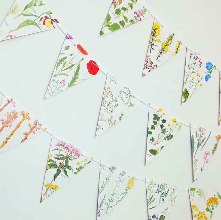 This lovely flower bunting has been up-cycled from a book about British wild flowers. This bunting is perfect as wedding decor or to hang in any room in your home to bring a little of the outside in!