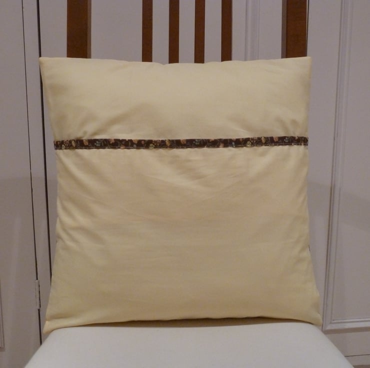 This cushion cover features an appliqué owl in shades of brown with a patchwork surround made from cotton squares in yellows, browns and oranges. The owl is appliquéd using zigzag stitch and the whole cushion is quilted in a square design.