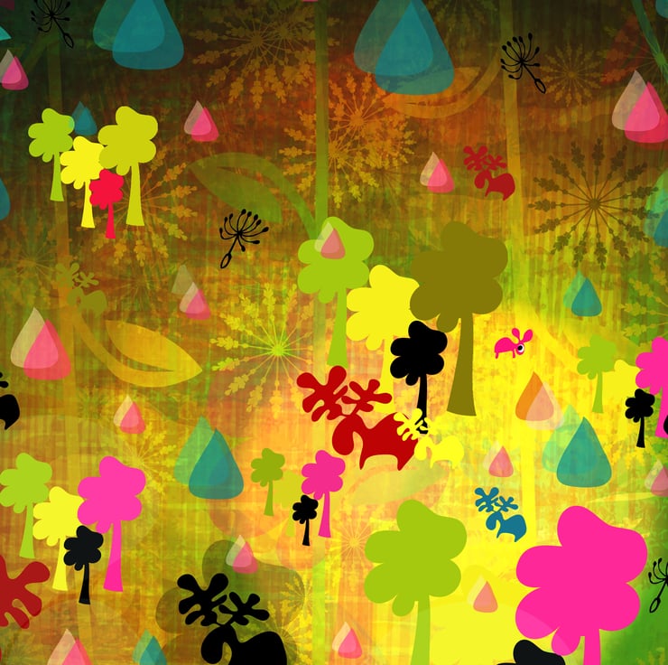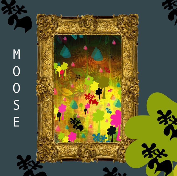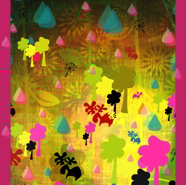 A forest scene of patterns and textures make up a lovely print in shades of greens. There are pinks and turquoise raindrops raining down on the Moose and the trees.