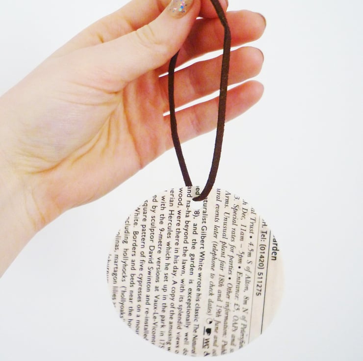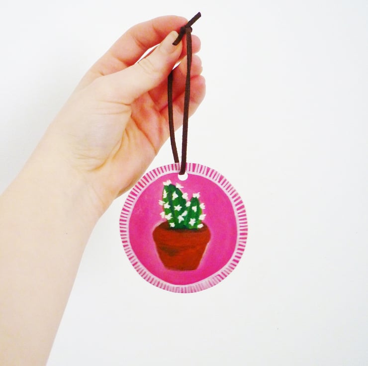 Hand painted cactus decoration measuring 7.5cm across. The decoration is coated in several layers of hard-wearing varnish and backed on a page from a book.