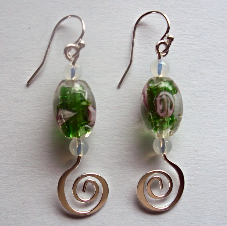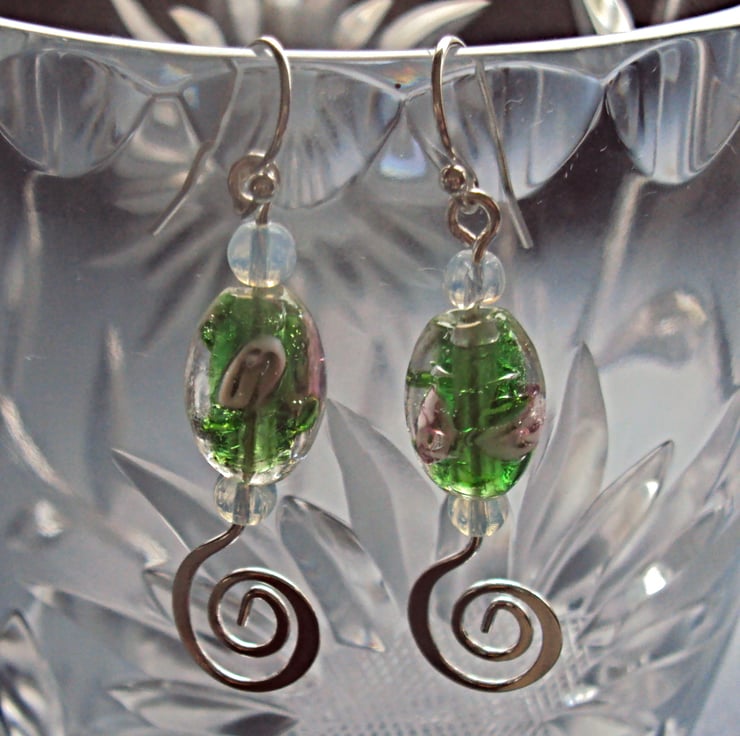 This pair of earrings have an green oval lampwork bead and two round opalite beads on a silver plated pin finished with a swirl.