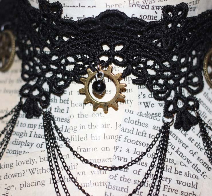 A black lace choker has been adorned with antique brass metal cog charms and fine black metal chain to create a steampunk inspired bespoke necklace. Designed to wrap around the neck and delicately grace the decolletage.