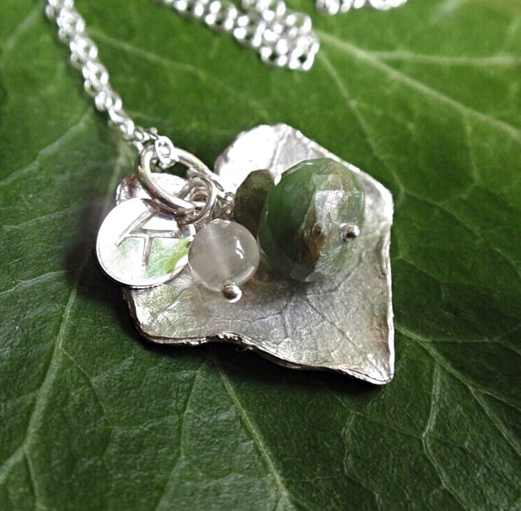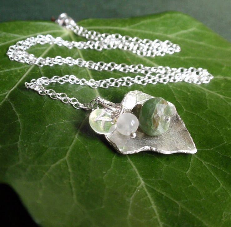 Sterling silver leaf necklace with ivy, Peruvian opal and moonstone. Personalised with an initial (optional)