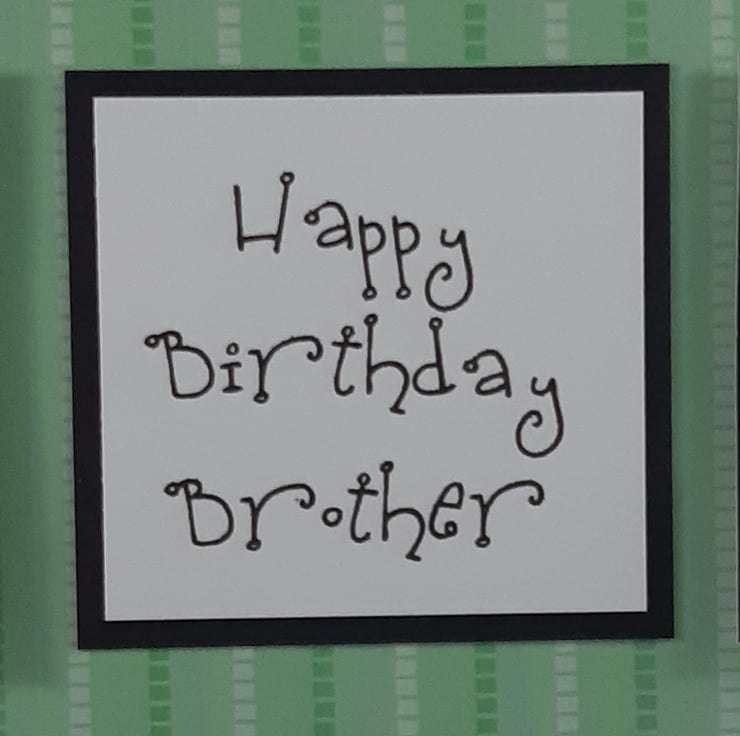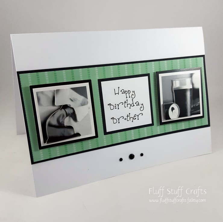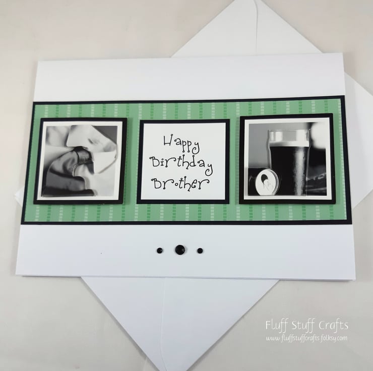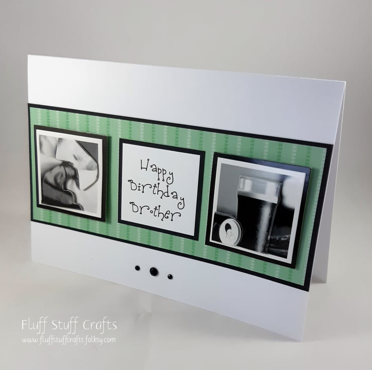 Happy Birthday Brother card. The card features two monochrome 3d images of a shirt and tie and a pint of beer either side of the printed sentiment 'Happy Birthday Brother', all overlaid onto pale green patterned paper.