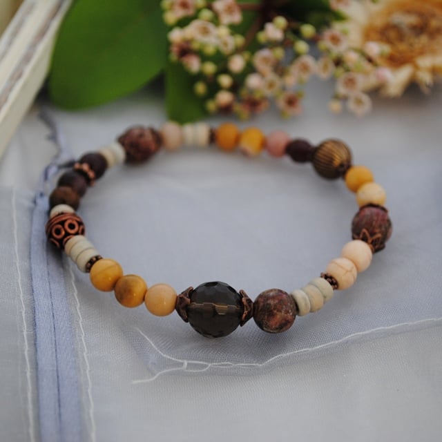 The stretch bracelet is made with 6mm mookaite jasper beads, a quality facetted smoky quartz bead, poppy jasper, natural howlite and coco-puclaet beads. The bracelet is finished with copper beads, antique copper bead caps & daisy spacers. .