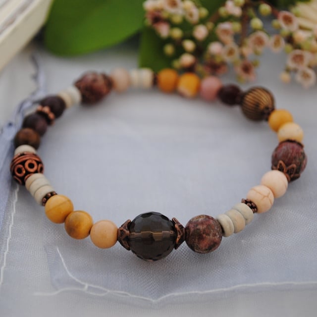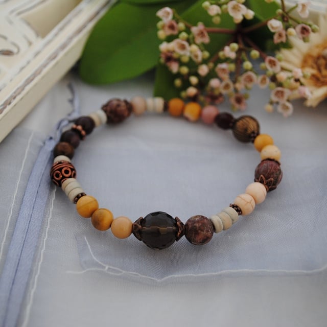 The stretch bracelet is made with 6mm mookaite jasper beads, a quality facetted smoky quartz bead, poppy jasper, natural howlite and coco-puclaet beads. The bracelet is finished with copper beads, antique copper bead caps & daisy spacers. .