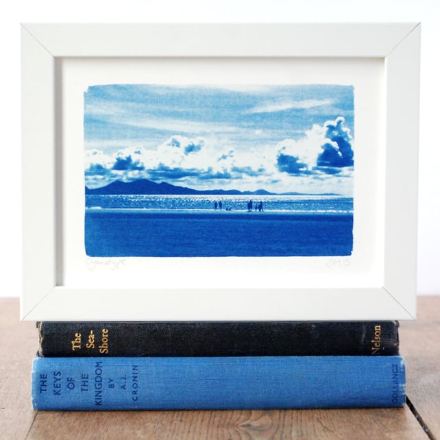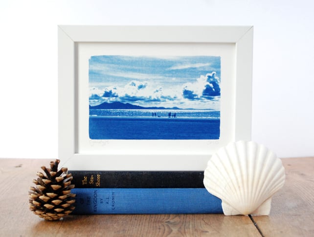 Original Cyanotype capturing the distinctive peaks of Yr Eifl on the Llyn Peninsula viewed from the wondrous Newborough Beach on Anglesey. Billowing clouds and folk silhouetted against a sparkling blue sea - bliss!