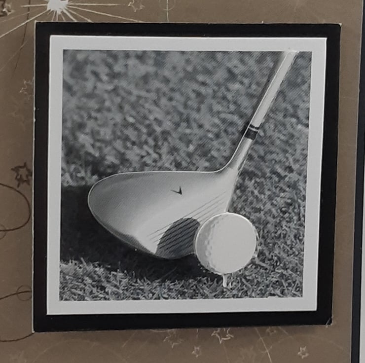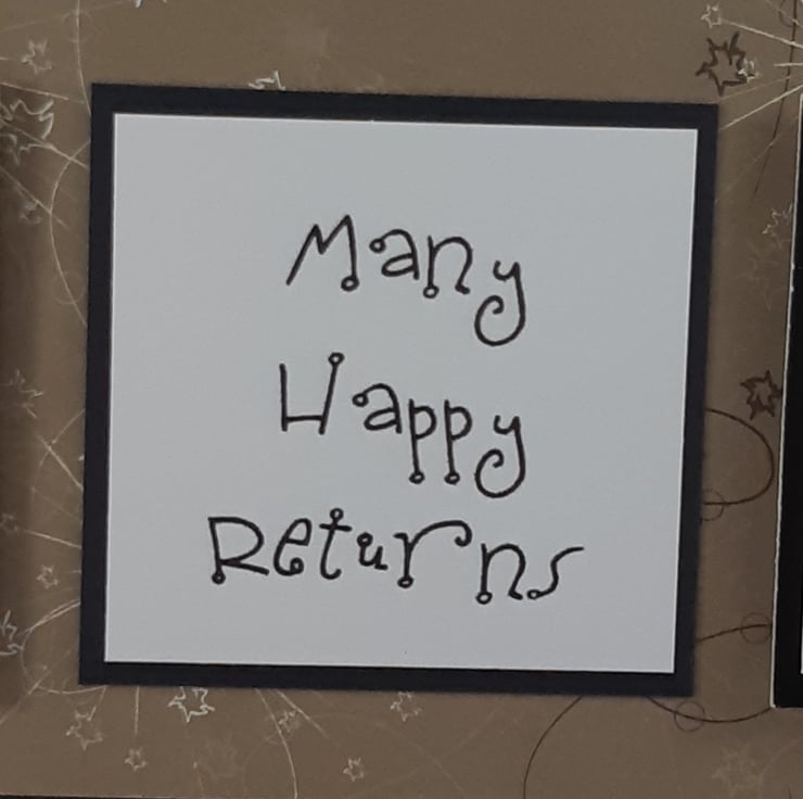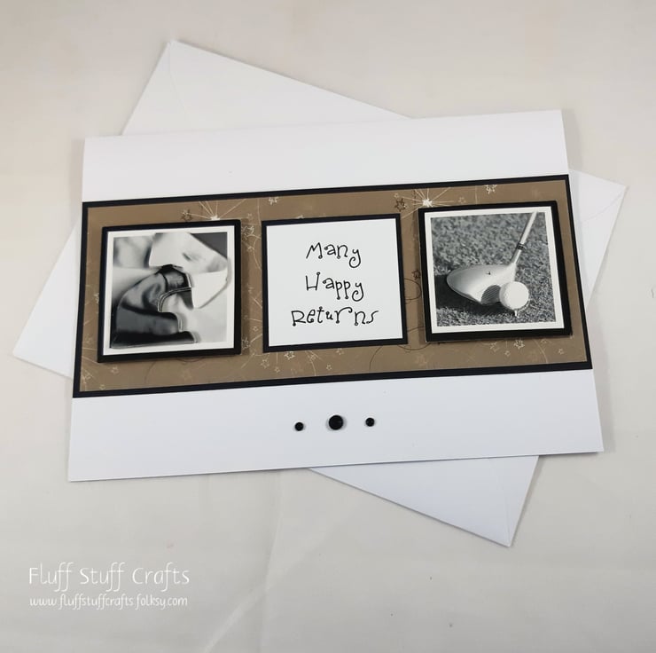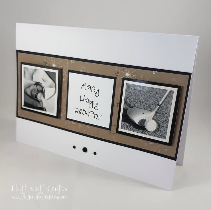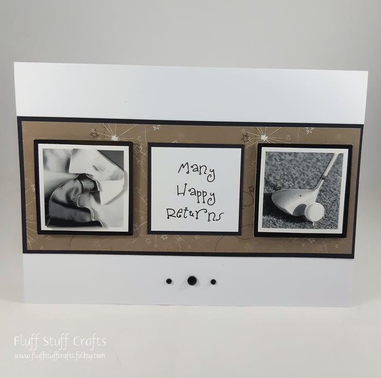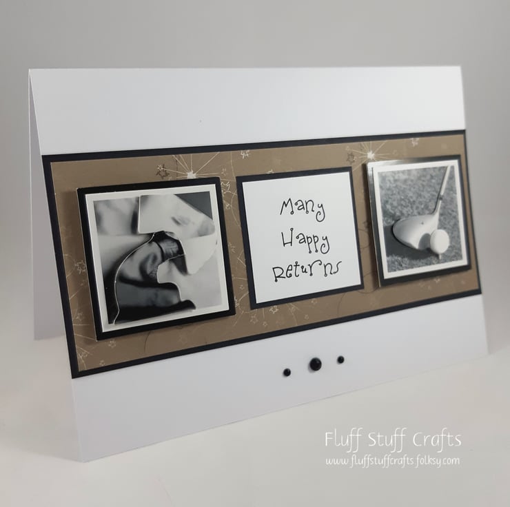 Birthday card featuring two 3d images of a shirt and tie and golf club, together with the message 'Many Happy Returns', overlaid onto a brown patterned background.