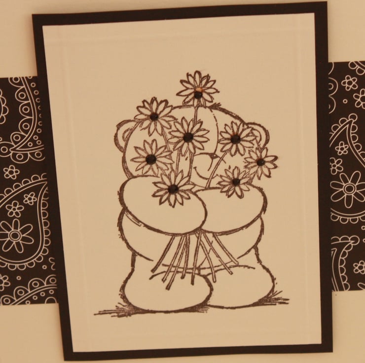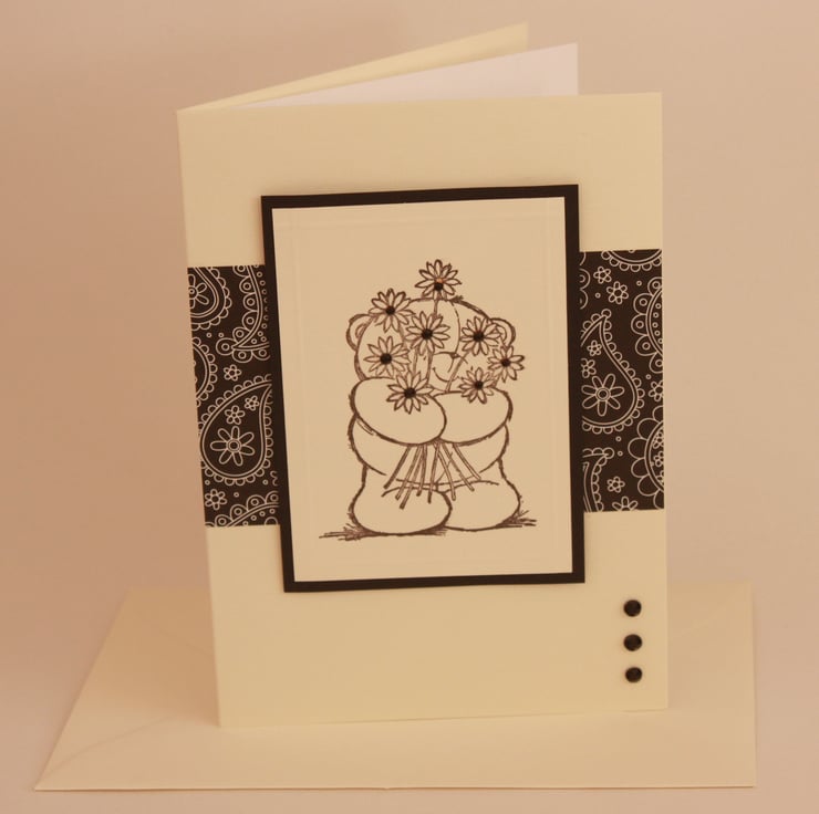 A6 cream card featuring a hand stamped Forever Friends bear holding a bunch of flowers on a Paisley patterned background. Each of the flower centres has had a small black gem.