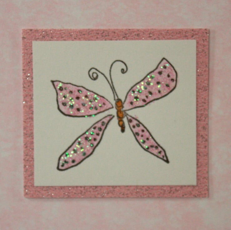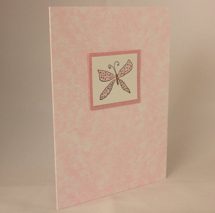 A6 pink patterned card featuring a hand stamped, coloured and glittered butterfly image.