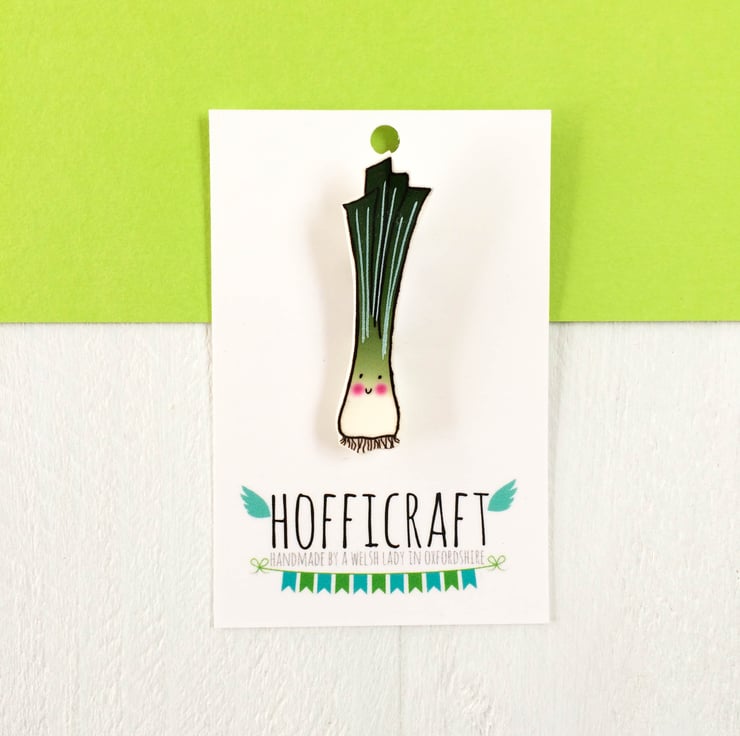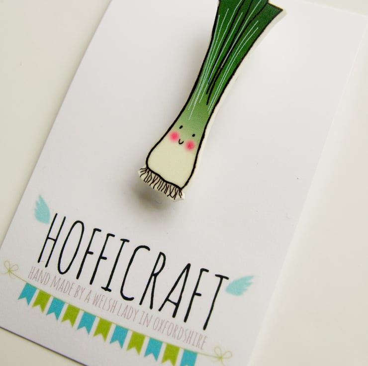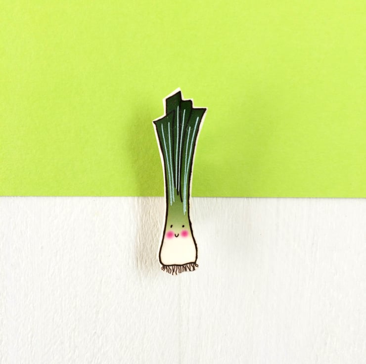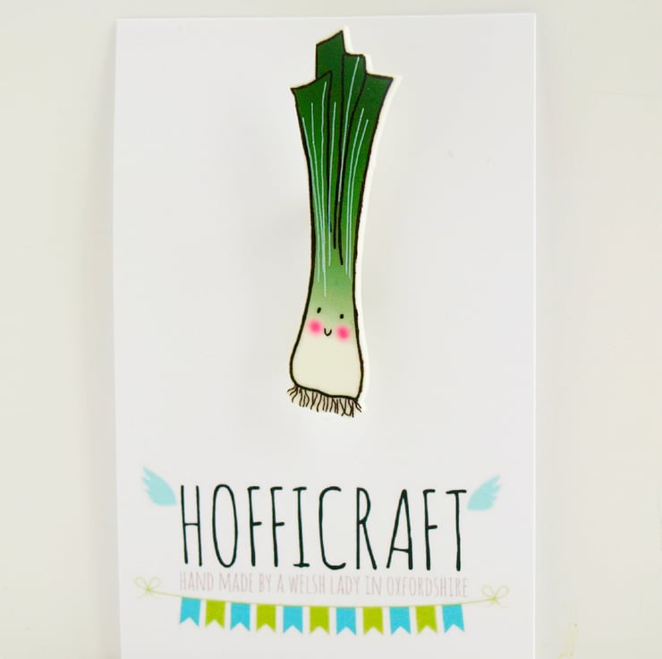 This little leek in an original illustration from my sketch book. It is scanned then digitally coloured before being printed to shrink plastic, each piece is hand cut and baked before being varnished and mounted on a badge pin.