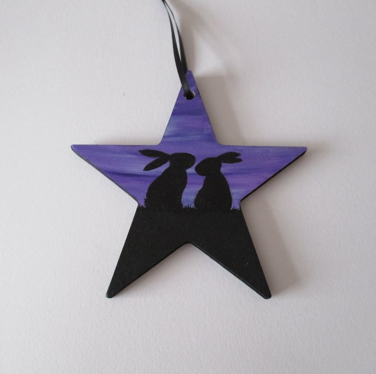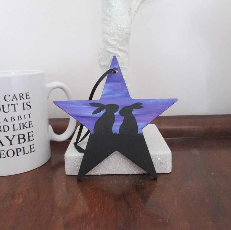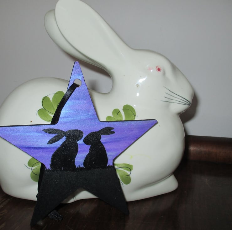 Key words: bunny bunnies rabbit silhouette silhouetted painting picture star hanging decoration sky Easter present gift Christmas stocking filler birthday wood wooden silhouette silhouetted sky dawn twilight