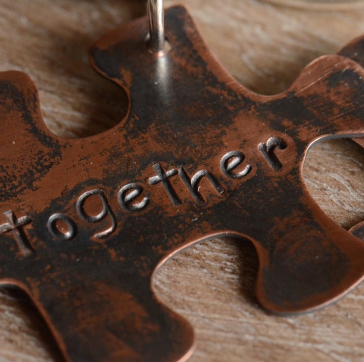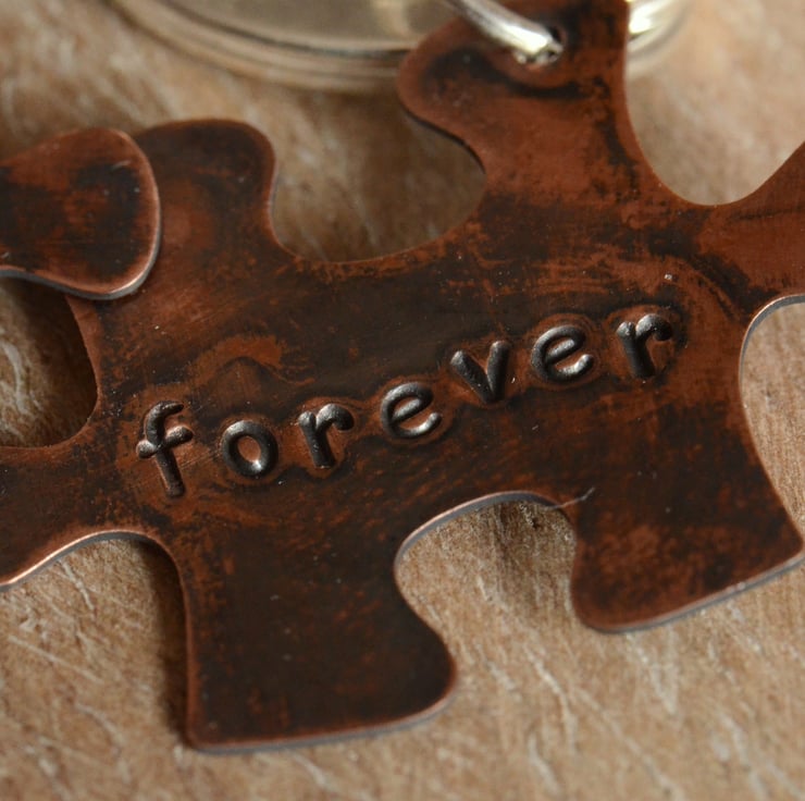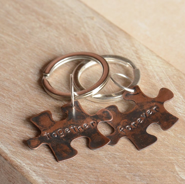I have hand stamped two copper jigsaw blanks, one with the word "Together" and the other "Forever". The pieces have been oxidised to give an antique effect and hand polished and finished.