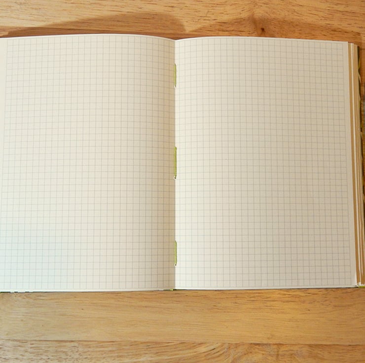 - The book contains 60 pages (120 sides) of high quality, mid-weight cream text paper,which is printed with 0.5cm squares, in light grey. The pages are stitched in six sets, with a long stitch binding.