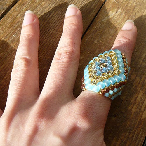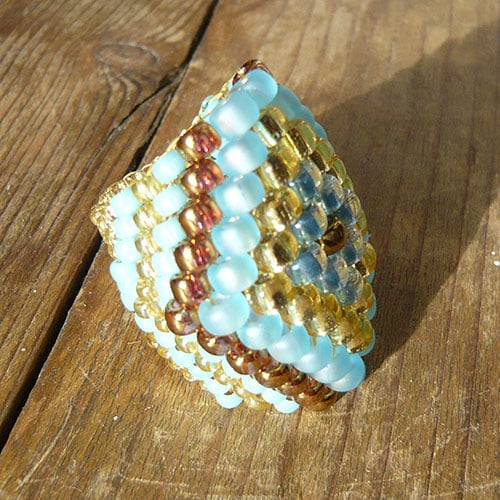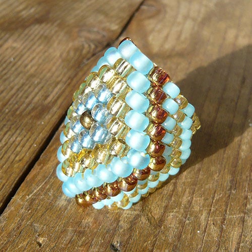 This ring is made of seed beads and about UK ring size F (14 mm in diameter)