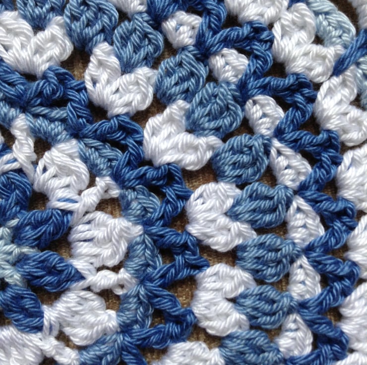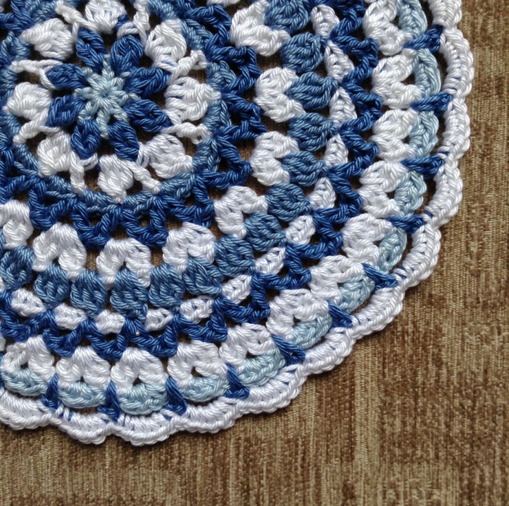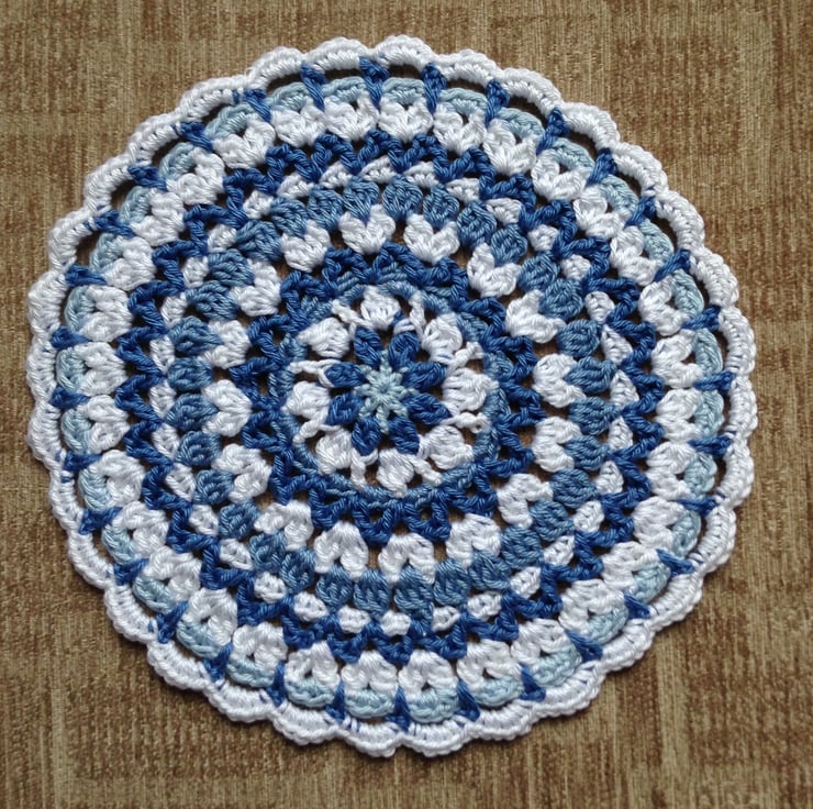 Crocheted Mandala style table mat in 3 shades of blue and white.