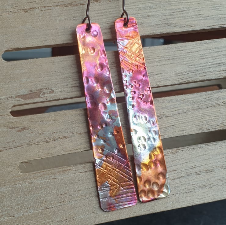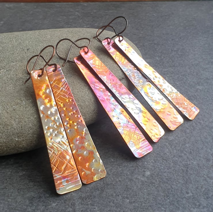 These long copper earrings have been hand cut from copper sheet which I heavily textured with a variety of hammers. The finished copper shapes have then been flame painted, which is to gently brush the surface of the metal with the tip of a soldering torch flame, this produces a rainbow of colours as the metal cools.