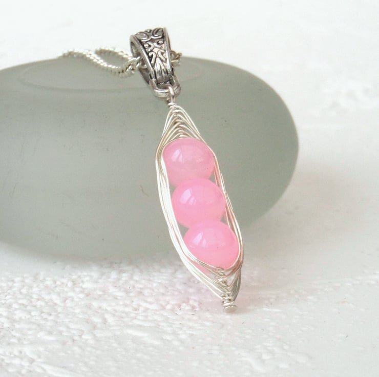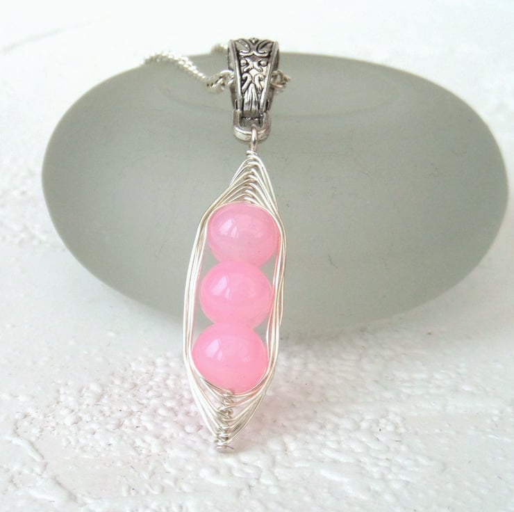 A pretty handmade necklace, made with pretty pink jade or coloured glass in a 'Peas in a Pod' style.