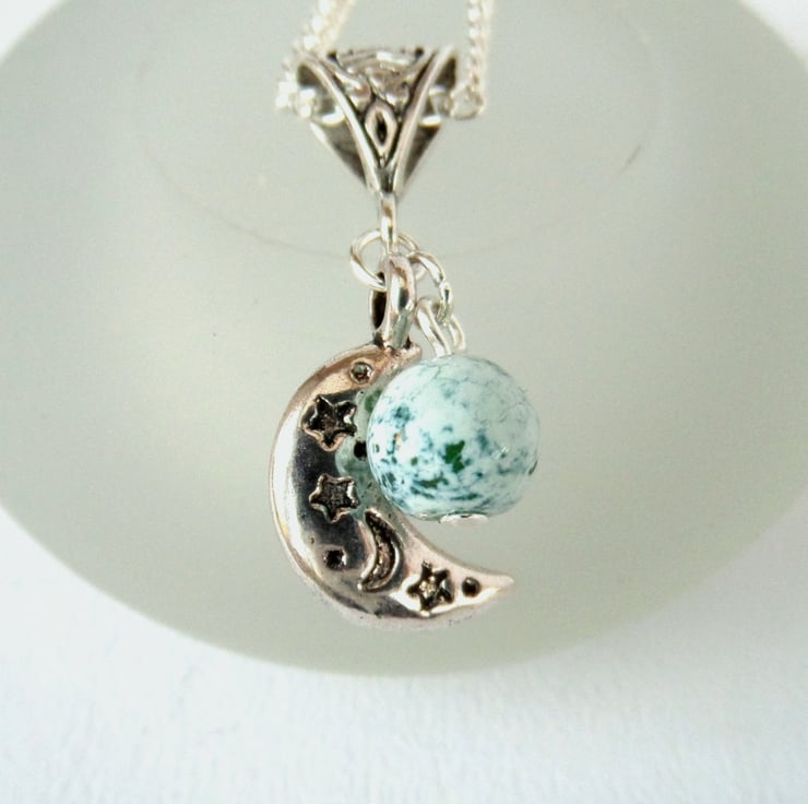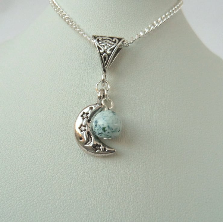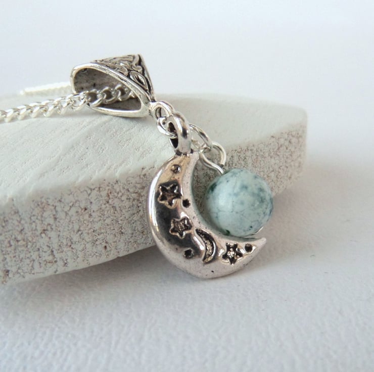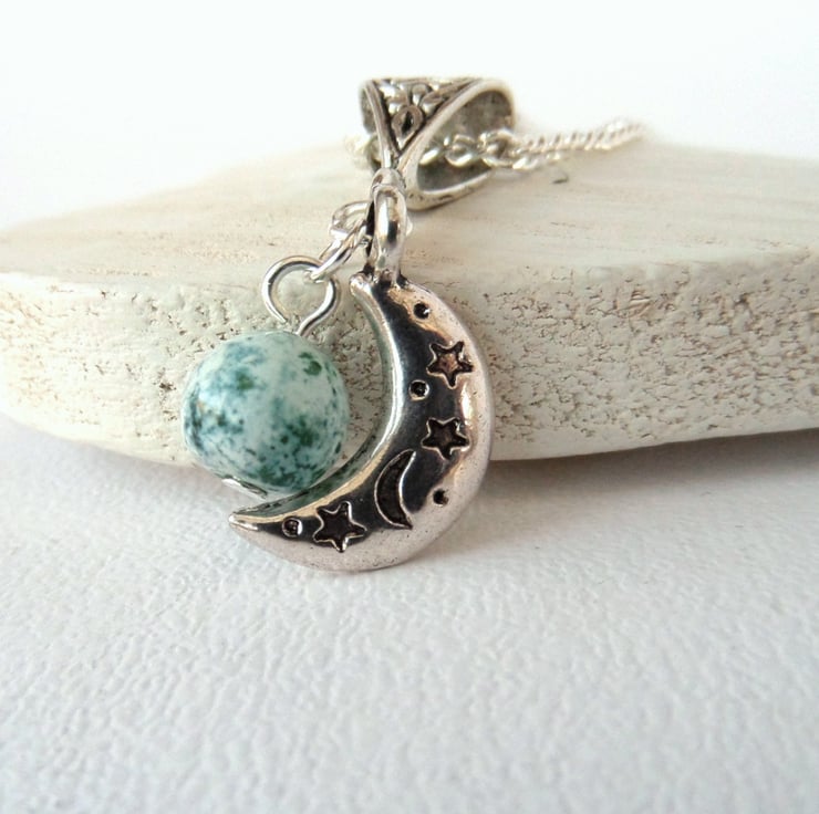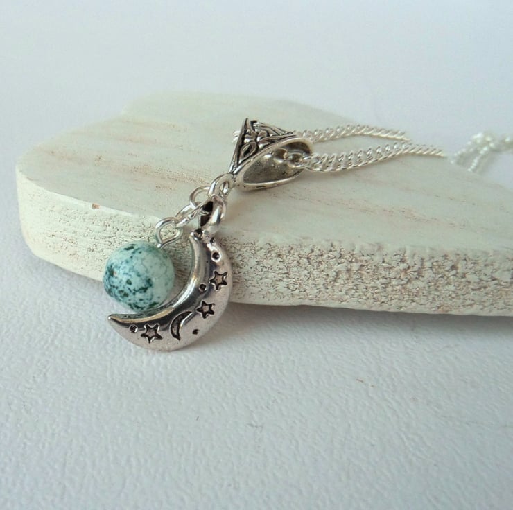 An unusual and captivating charm necklace, with a beautiful green fire agate hanging with a tibetan silver crescent shaped moon charm.