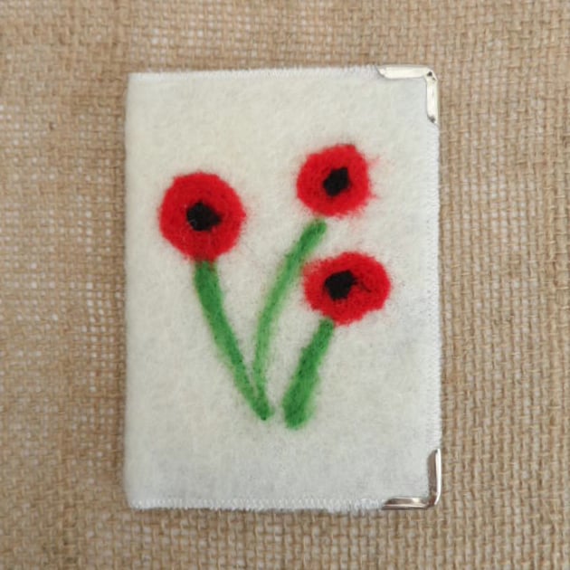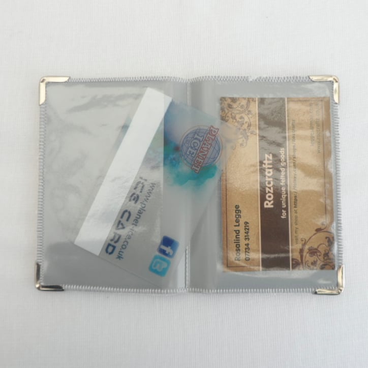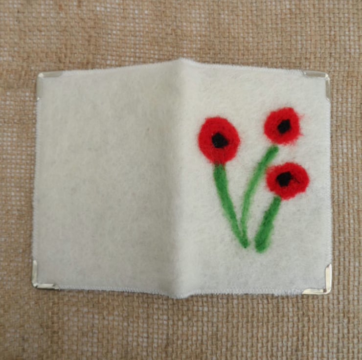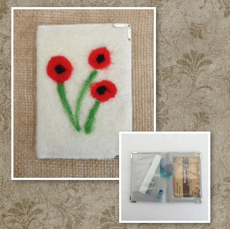 A simple card holder for your bus pass, ID card, business cards or credit cards. Hardwearing grey plastic on the inside with clear pockets allowing card visibility without having to remove them. An outer covering of handmade felt has been stitched securely into place. The felt has been made using a nuno felting technique whereby white NZ perendale wool has been felted to a cotton muslin base to give it strength and stability. Three poppies have been needle felted onto the front cover. Complete with silver coloured metal corner protectors to increase durability. It measures approximately 3" x 4" and has two pockets available for cards/passes. Each pocket can take several cards.