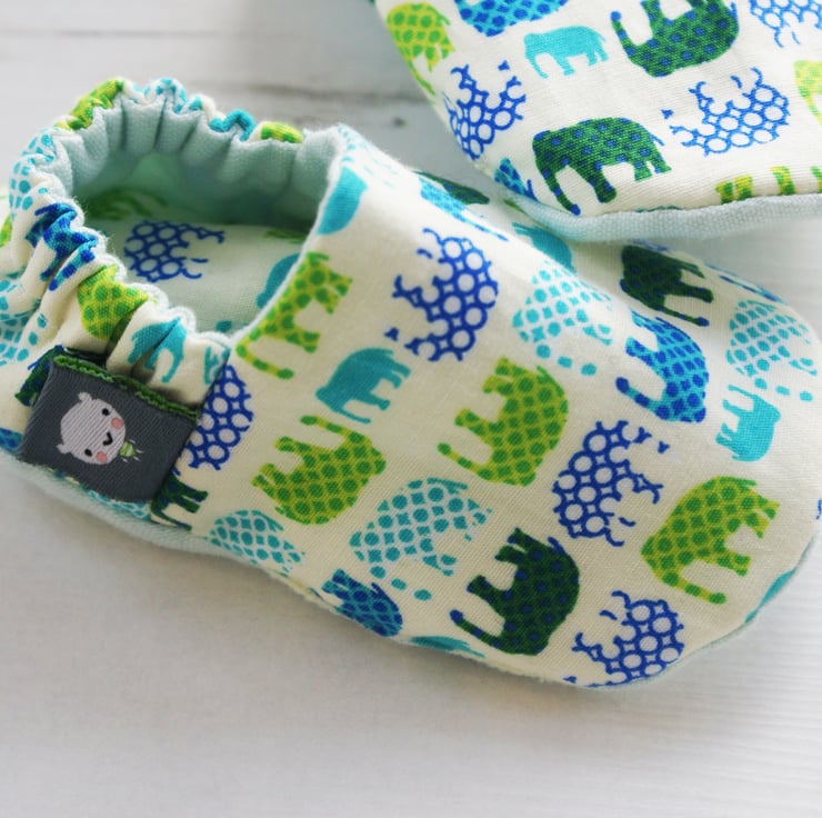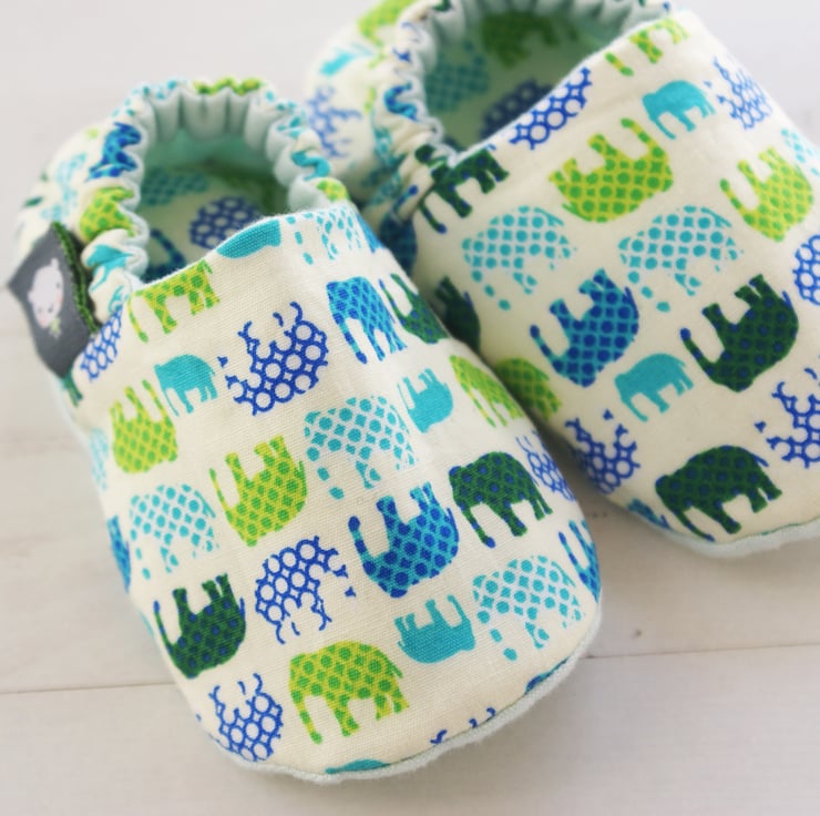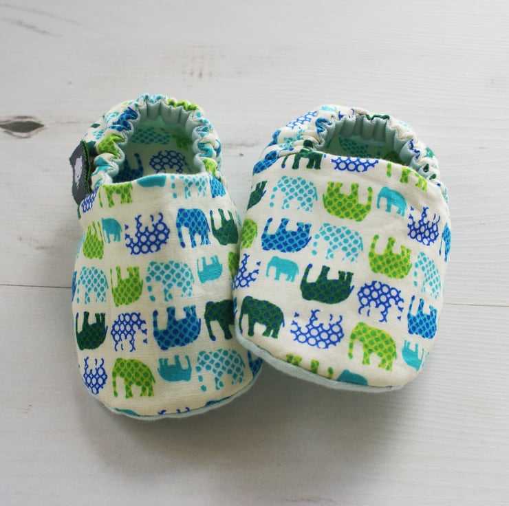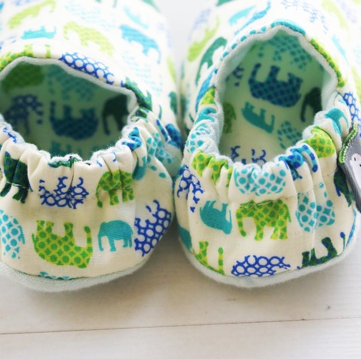 ORGANIC BABY PRAM SHOES in an ultra cute green & blue Mini Elephants print fabric. The Pram Shoes outer are made from 100% Cotton. Fully lined with NO raw edges in a luxurious organic bamboo cotton & 100% organic cotton lining with elasticated heel - ensuring comfort for your little one.