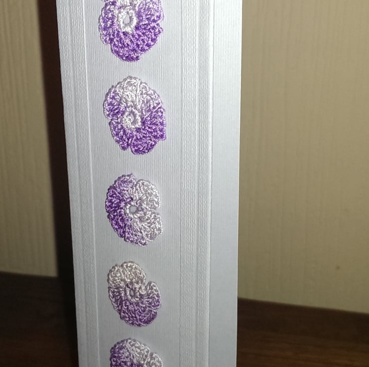 LINEN EFFECT CARD IN LILAC, WITH 5 SMALL LILAC FLOWERS (HAND CROCHETED)