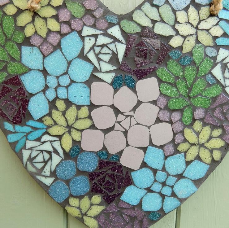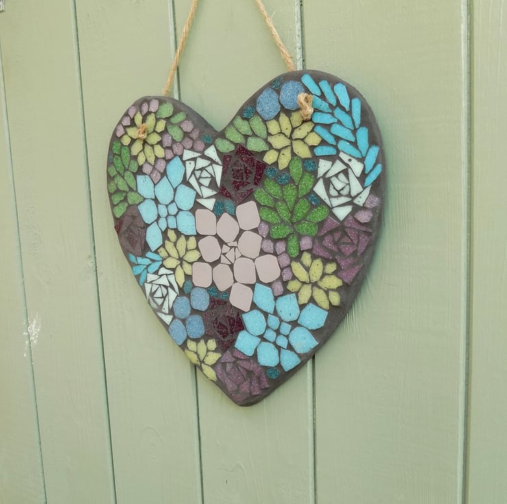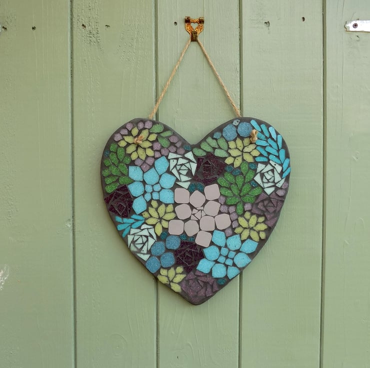 A 25cm tall x 25cm wide slate heart base with a mosaic made out of vitreous glass tile, and comes with a D ring hanger, and decorative twine hanger. The mosaic is finished with a black grout that is designed to repel algae and mold.