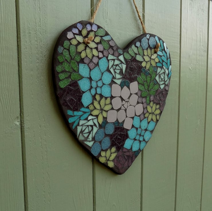 A hanging heart with mosaic succulent design that will always look great, and never need watering or maintenance. The succulents are in shades of greens and purples which have a lovely, calming feel. A very modern, contemporary design, but it would suit any style of garden, or could be used as wall decor in the home. It would make a great new home gift, or a gift for a garden lover.