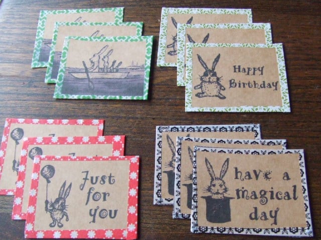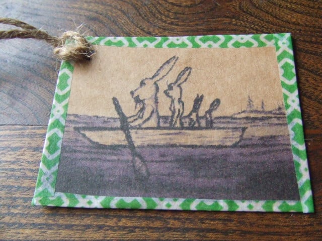 Adorable set of 12 bunny rabbit gift tags to adorn your presents. three of each design.Made from lovely recycled manilla card, washi tape & twine. The washi tape edging may be different from the photograph shown but will be similar.
